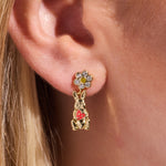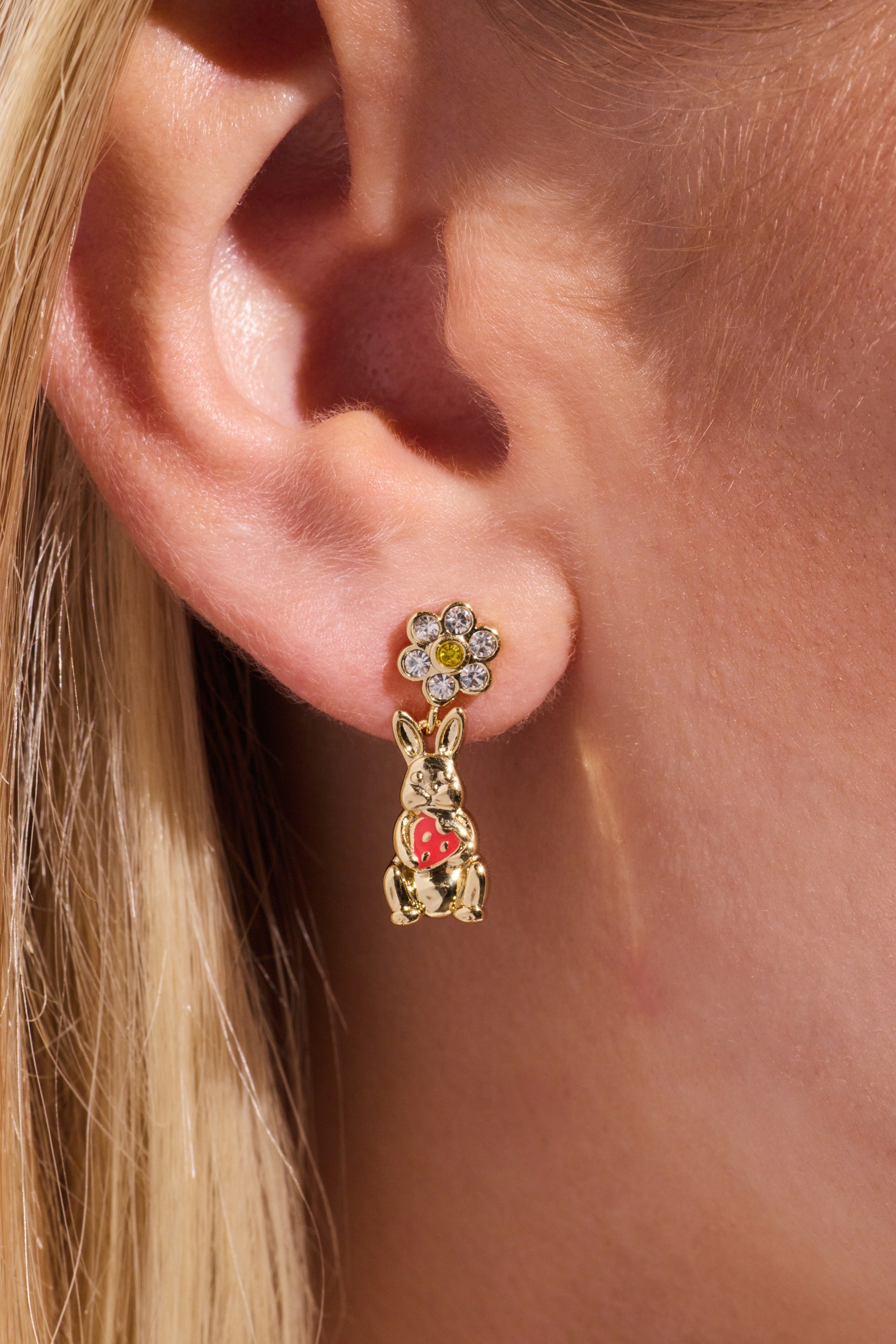 Adorable stud earrings featuring a sparkling crystal flower paired with a whimsical metal bunny charm clutching a cheerful enamel strawberry. Perfect for adding a touch of springtime fun and personality to any look.