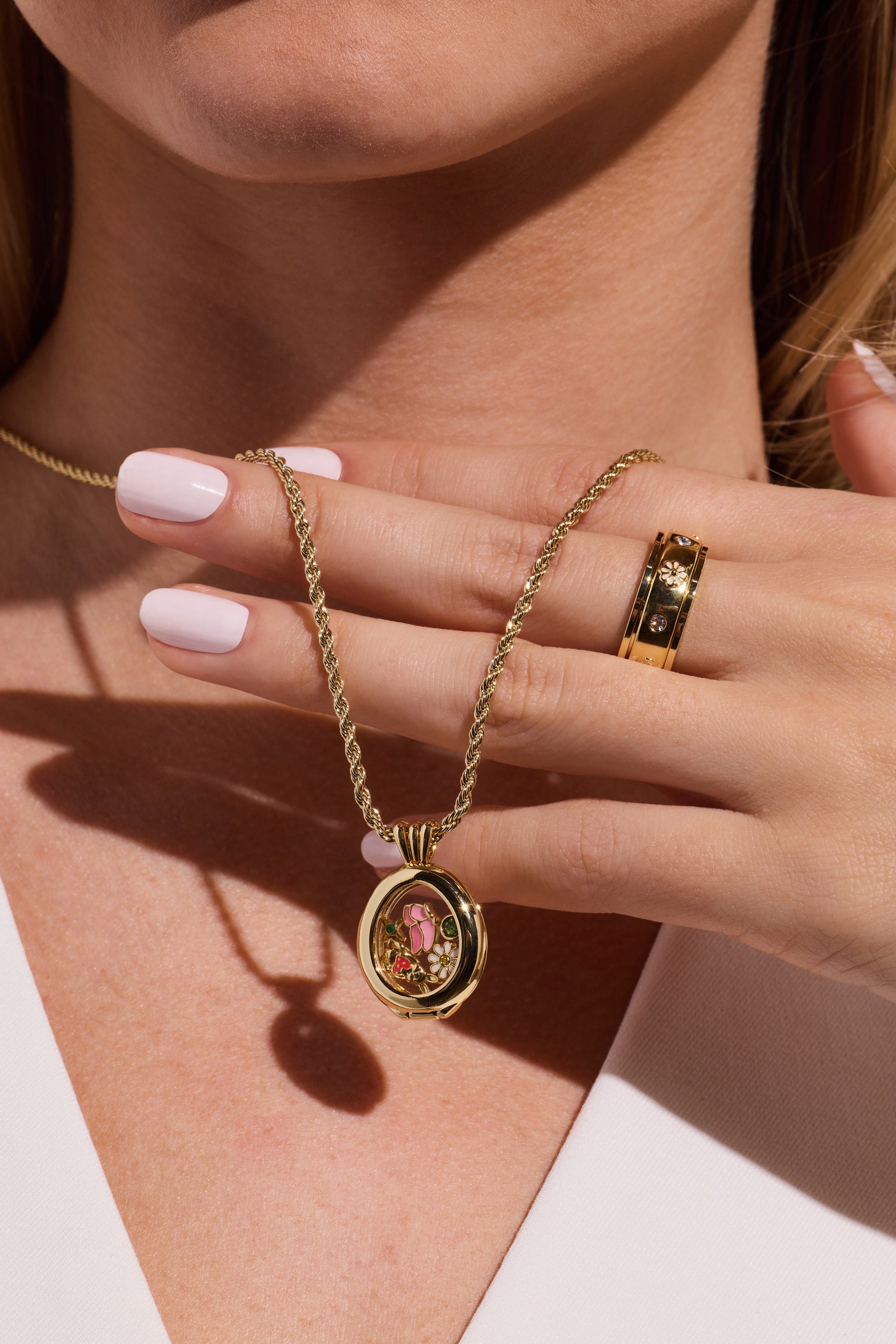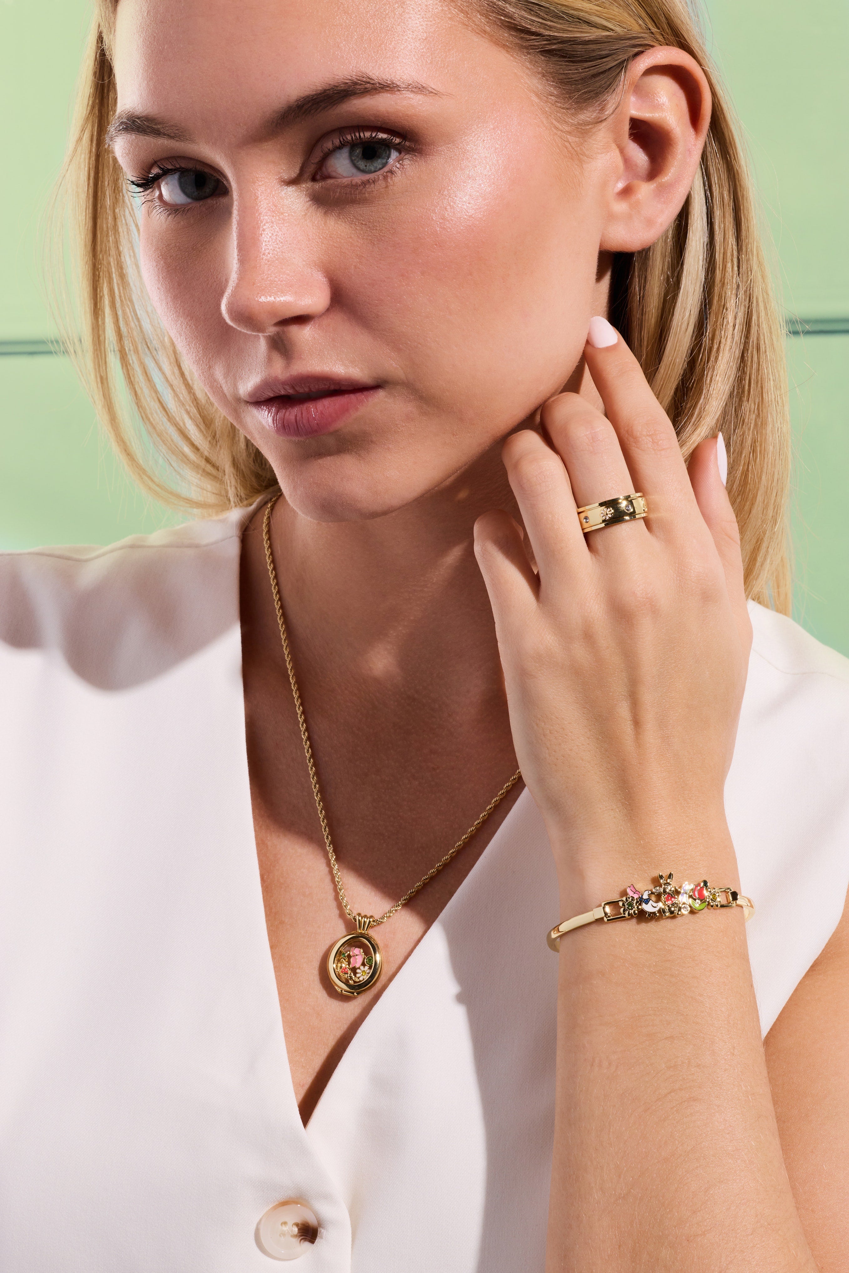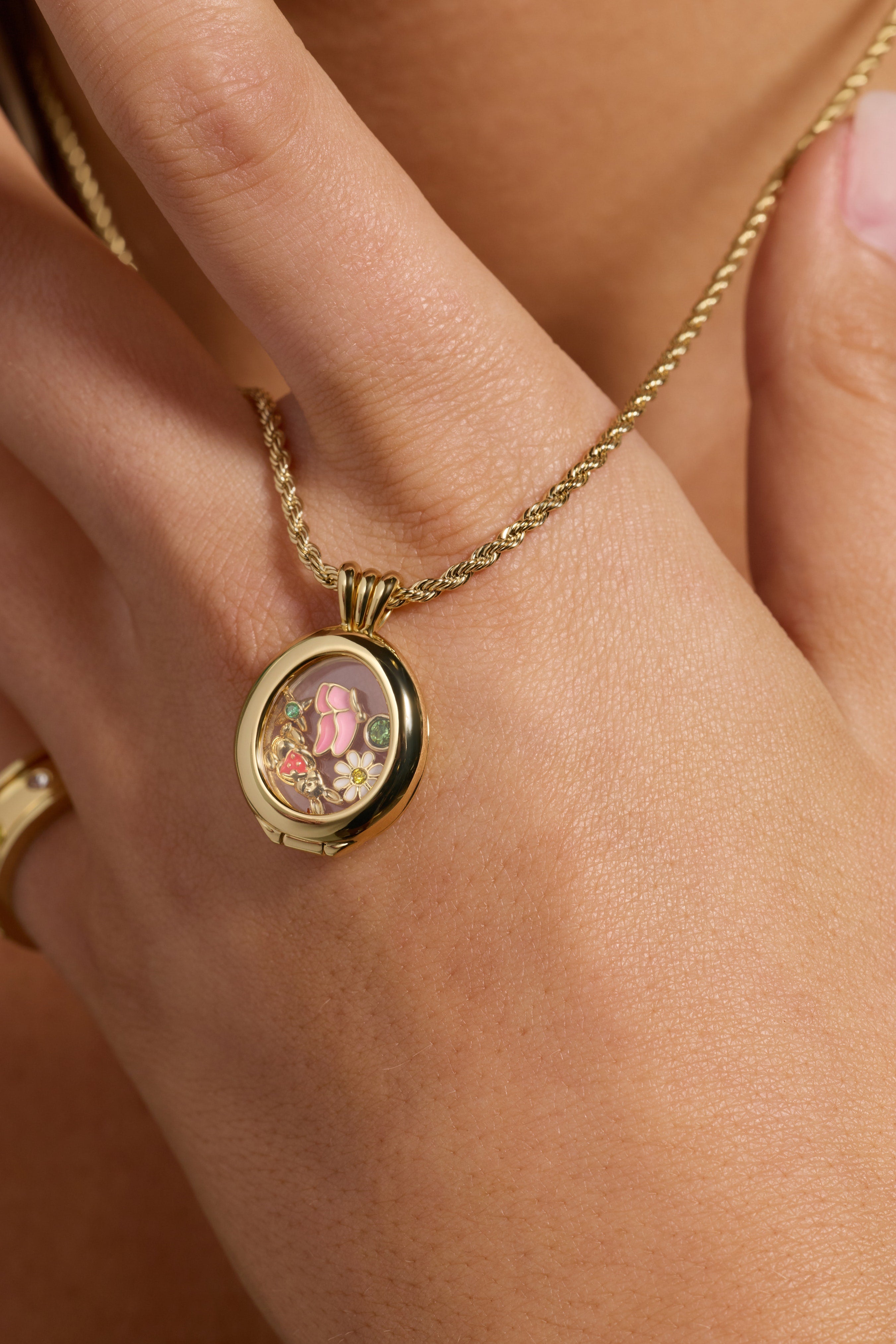 Watch delightful charms dance and jingle inside this whimsical shaker pendant. Featuring a charming butterfly, adorable bunny, cheerful flower, and sparkling stone details, each movement creates a delightful surprise. Perfect for adding a touch of playful elegance to your everyday style.