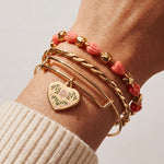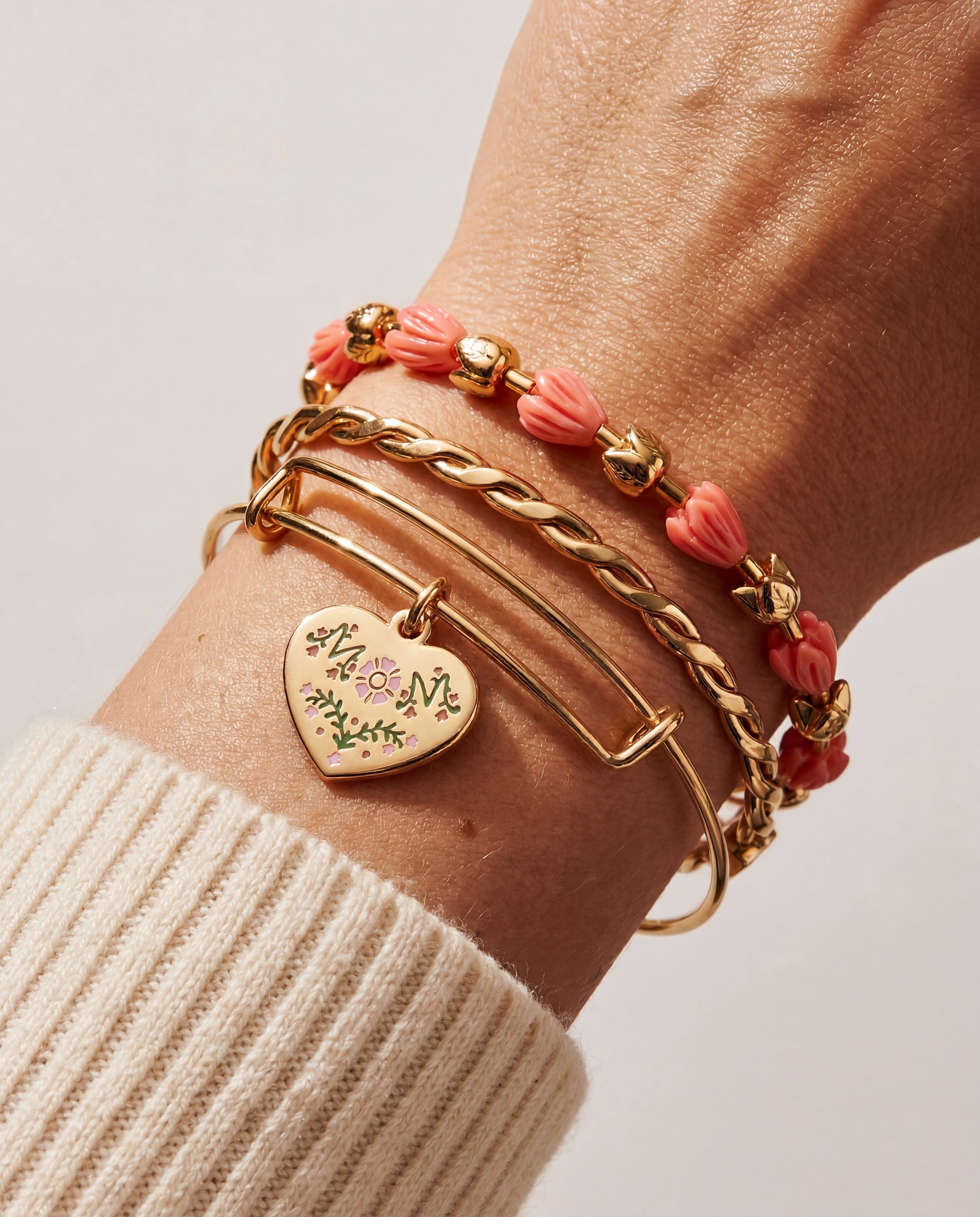A mother’s love is always in full bloom. This set of 3 bracelets is a floral tribute to her: a basket-weave bangle for strength, a charm bangle with MOM spelled in delicate flowers, and a pink and gold tulip bracelet symbolizing love and gratitude. A perfect gift for the one who nurtures, loves, and inspires every day.