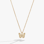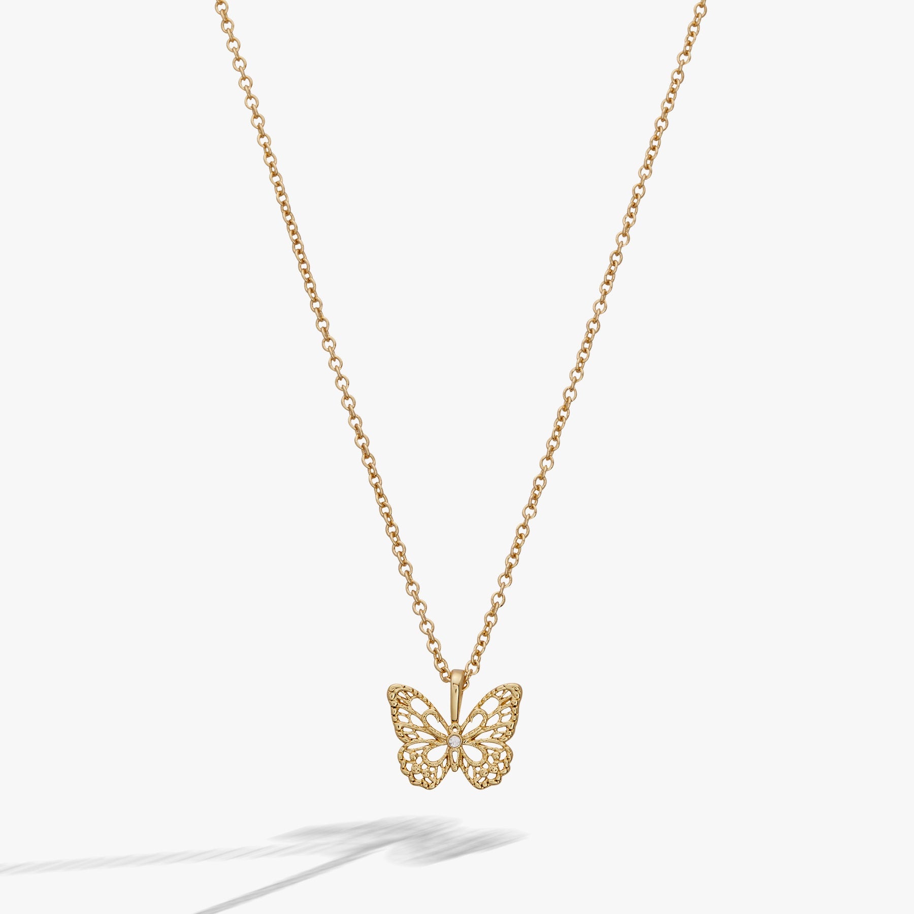 Delicate filigree butterfly pendant adorned with sparkling clear crystal accents, suspended from a gleaming gold-plated cable chain. This spring-inspired piece captures the essence of transformation and renewal, perfect for layering or wearing solo. A timeless addition to your everyday jewelry collection.
